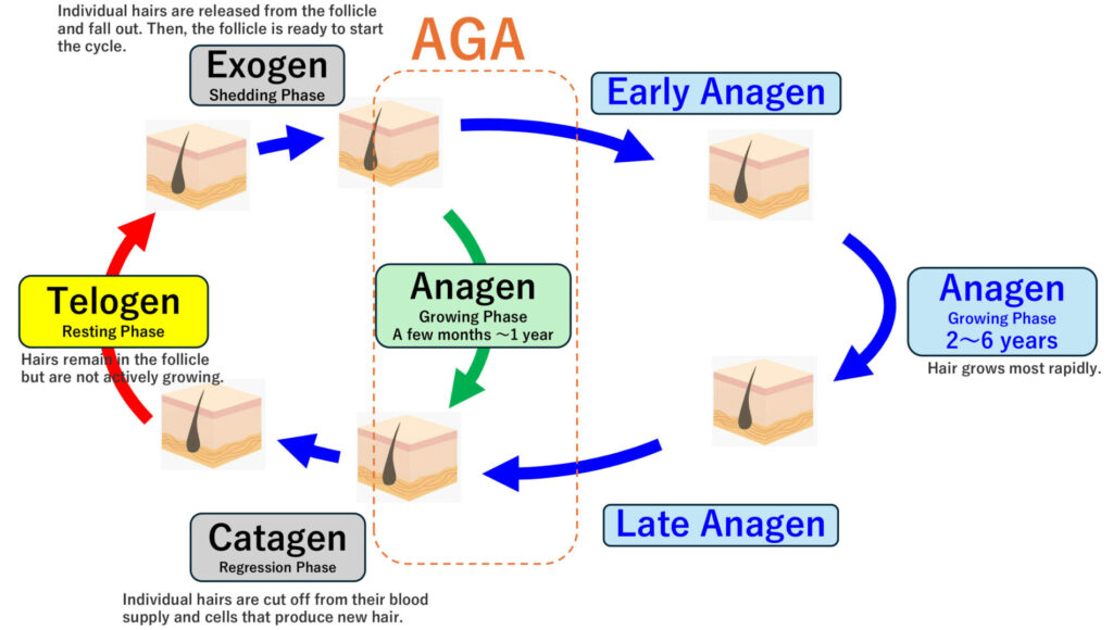Human hair grows from hair follicles. A single follicle typically undergoes about 10 to 30 hair cycles before eventually ceasing to function. This cycle includes a growth phase (anagen) that normally lasts two to six years. In AGA, the core problem is a shortening of the growth (anagen) phase, which increases the proportion of follicles stuck in the resting (telogen) phase.