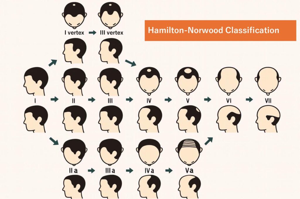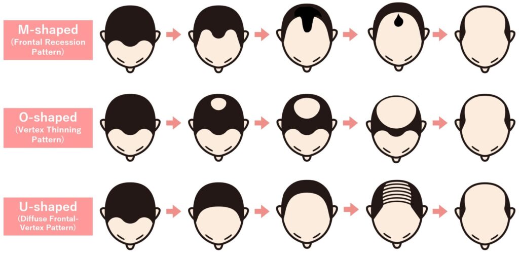 The most commonly used system for assessing the pattern and severity of AGA is the Hamilton–Norwood classification. Based on this scale, AGA progression can be broadly divided into three main patterns. Among Asian populations, including Japanese individuals, the U-shaped pattern is reported to be the most common, followed by the O-shaped pattern.