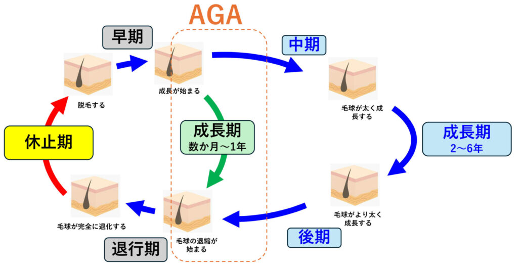 人の毛髪は毛包から出てきます。一つの毛包は、通常2~6年の成長期を含む毛周期を10~30サイクル繰り返した後、完全にその役目を終えることが分かっています。男性型脱毛症は、毛包の「毛周期」における成長期の期間短くなり,休止期にとどまる毛包が多くなってしまうことが病態の基盤です。