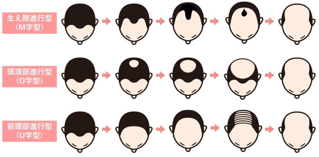 剃り込みのように左右の生え際が後退し始め、頭頂部にかけて進行します。M字型は鏡で見えますので、比較的早期からその存在に気が付きます。